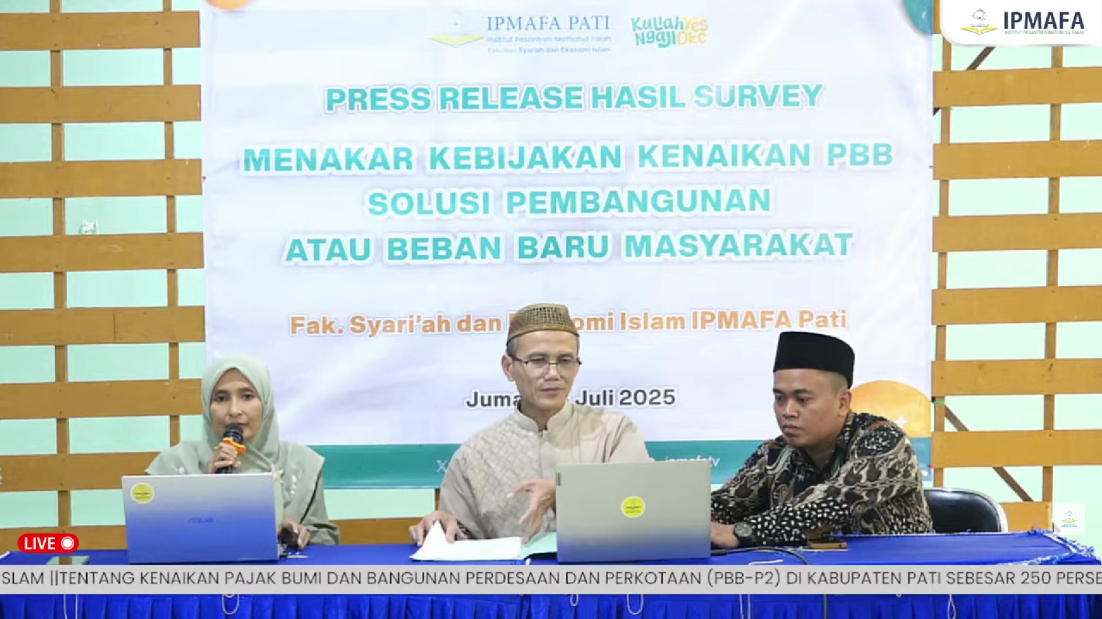 Pati, Katakampus.com – Sebanyak 98 persen warga Kabupaten Pati menyatakan keberatan terhadap kebijakan kenaikan Pajak Bumi dan Bangunan (PBB) yang diberlakukan melalui Peraturan Bupati (Perbup) Nomor 8 Tahun 2025. Temuan ini berdasarkan hasil survei yang dilakukan oleh Fakultas Syari’ah dan Ekonomi Islam Institut Pesantren Mathali’ul Falah (IPMAFA) Pati.