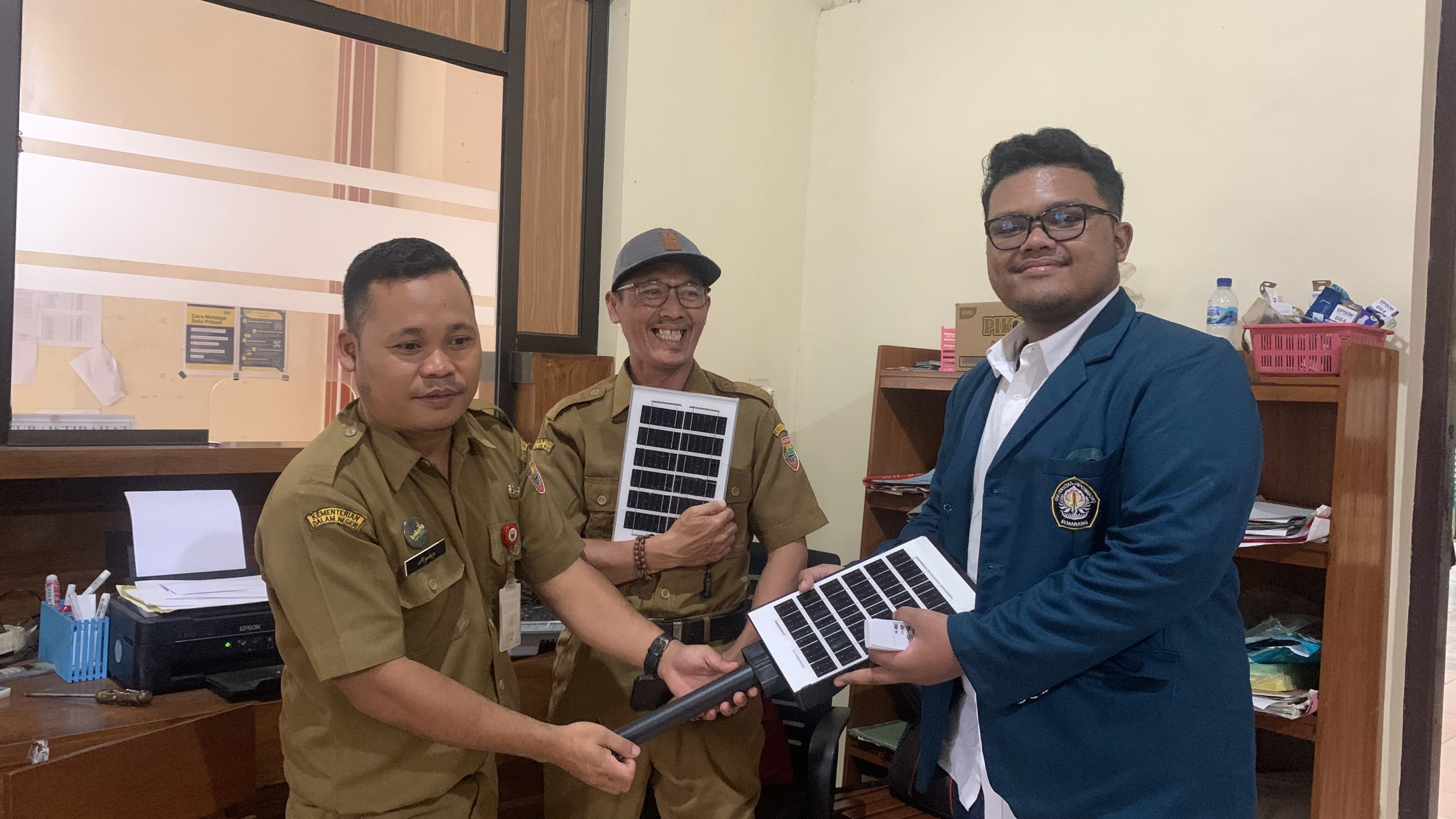 Tim KKN menyerahkan beberapa unit lampu panel surya kepada perangkat desa sebagai simbolis kegiatan. Lampu-lampu ini diharapkan dapat dimanfaatkan untuk penerangan di lingkungan desa, sekaligus menjadi contoh nyata dari penggunaan energi terbarukan.