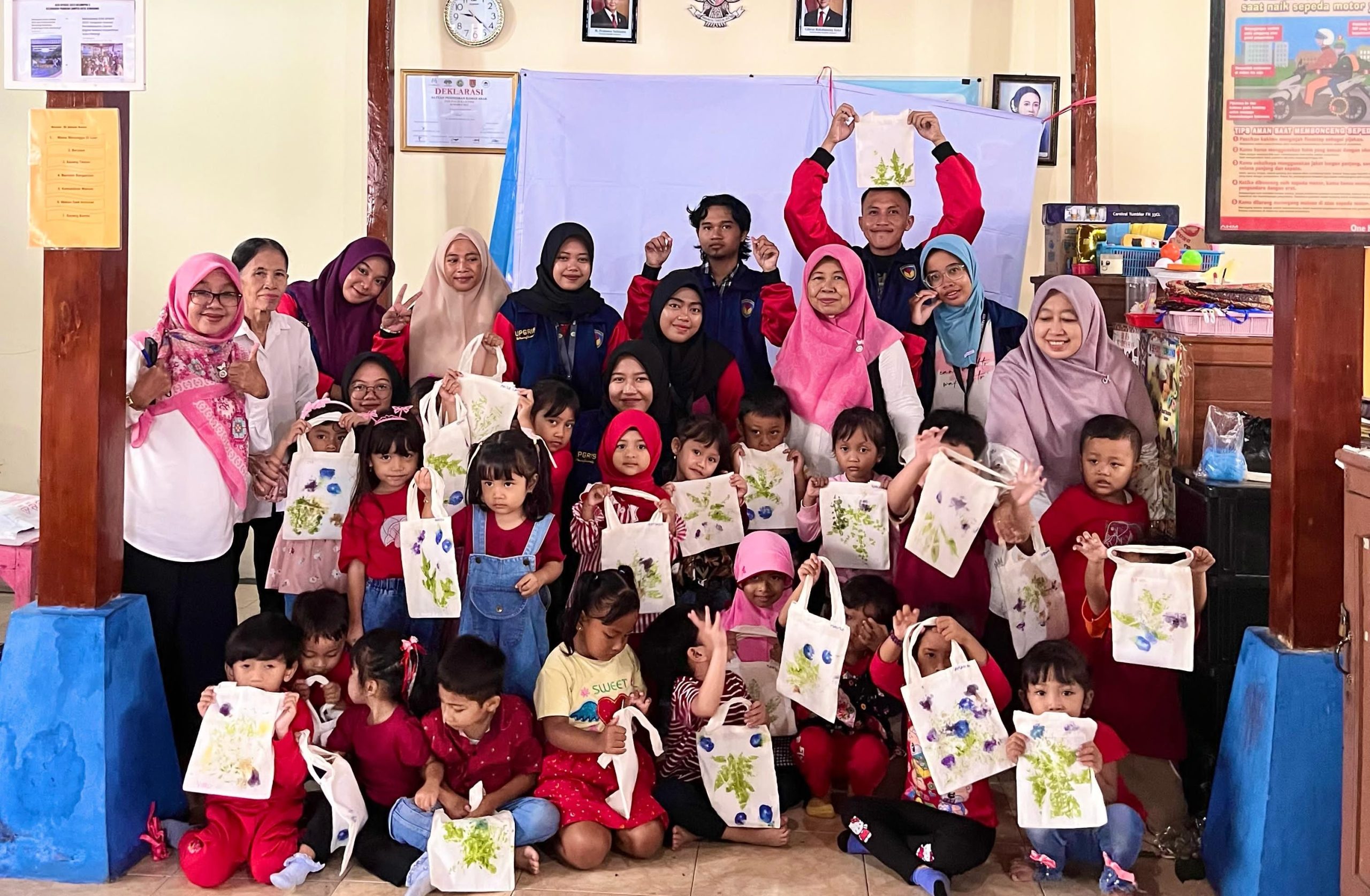 Dalam kegiatan ini, para mahasiswa membimbing anak-anak dalam proses pembuatan Eco Print, mulai dari pemilihan bahan alami, teknik pencetakan, hingga tahap pewarnaan. Anak-anak tampak antusias saat menempelkan daun dan bunga ke kain, menciptakan pola unik yang menarik.