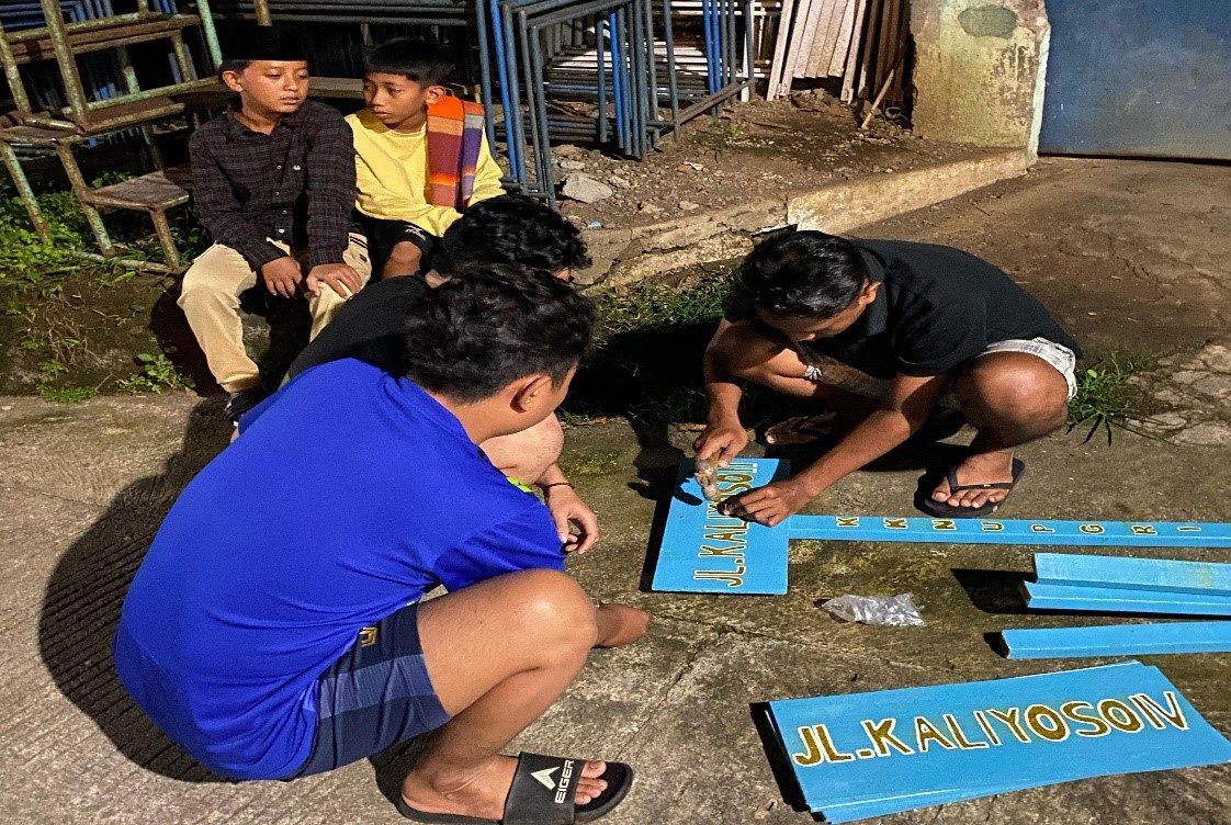 Proses pemasangan plang jalan dilakukan secara gotong royong oleh anggota KKN bersama warga setempat. Sinergi antara mahasiswa dan masyarakat membuat kegiatan ini berjalan lancar dan mendapat dukungan penuh.