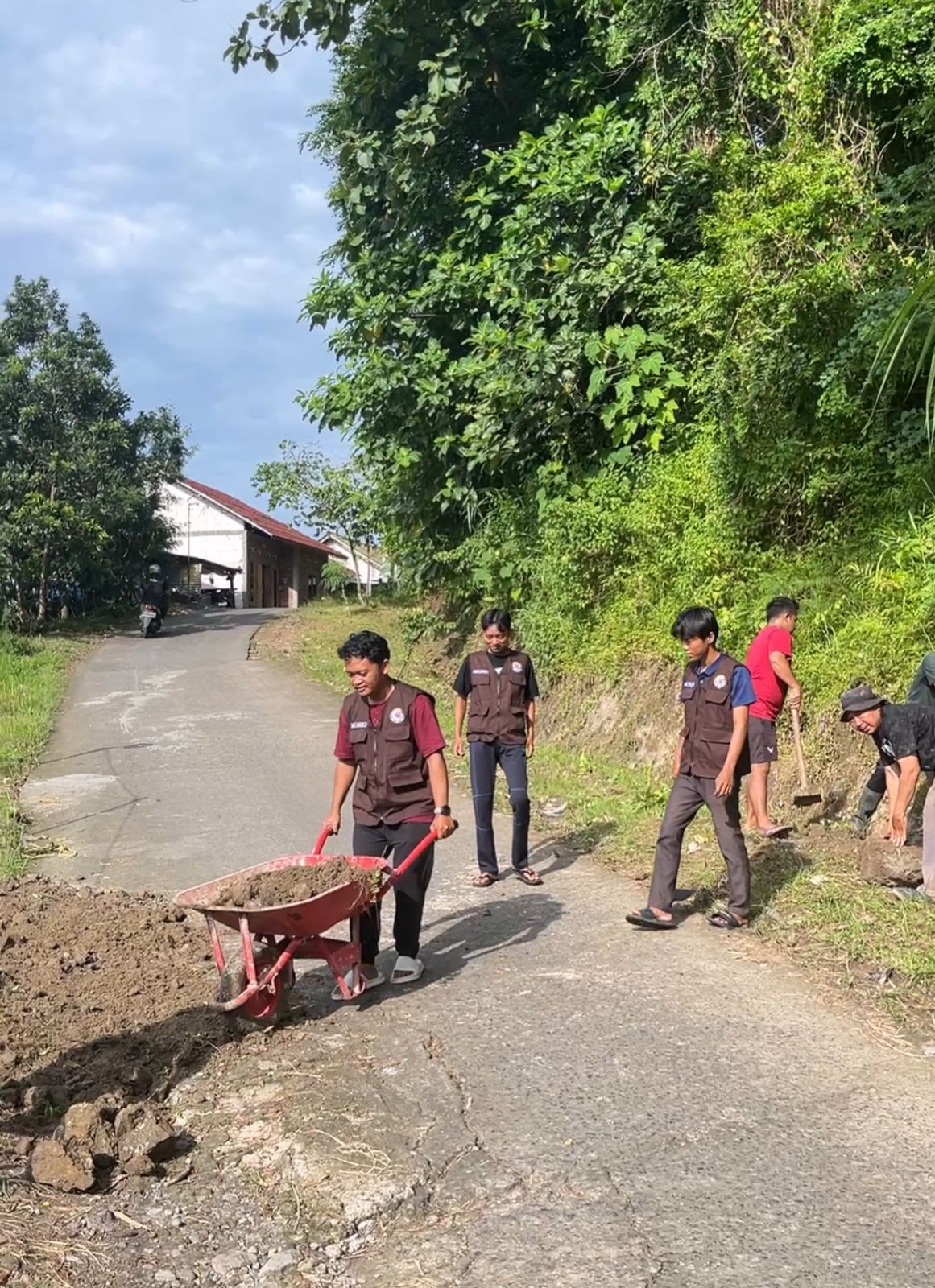 Mahasiswa KKN bersama masyarakat setempat bahu-membahu membersihkan tanah dan bebatuan yang menutup akses jalan serta memperbaiki saluran drainase yang terganggu akibat longsor.