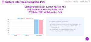 Halaman inilah yang paling penting karena memuat hal utama dalam penelitian ini. Halaman ini berisi Perbandingan 2 Peta Kabupaten Pati berdasarkan Kasus Stunting dan ketika mousepad digeser ke pata, data yang dimasukkan akan terlihat. Halaman ini juga bersisi tabel dan grafik perbandingan apotek, ahli gizi, dan kasus stunting di kabupaten pati pada tahun 2020 dan 2021.