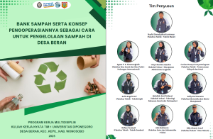 Program pengelolaan sampah di Desa Beran ini dilakukan dengan melakukan penyuluhan tentang metode-metode untuk mengelola sampah mulai dari tingkatan setiap kepala keluarga, UMKM, hingga pengelolaan sampah di Tingkat Desa. Sosialisasi ini dilakukan kepada Perangkat Desa Beran, BPD Desa Beran, Ketua RW, dan Ketua RT setempat sebagai perwakilan masyarakat di Desa Beran. Buku panduan karya KKN Tim 1 Desa Beran juga diberikan kepada Perangkat Desa sebagai pedoman untuk keberlanjutan program tersebut dan panduan untuk perencanaan pengolahan sampah ke depannya.